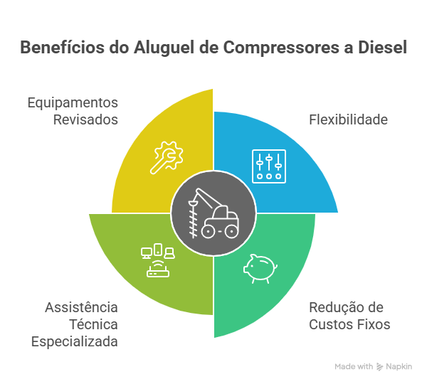 O aluguel de compressor a diesel se destaca por evitar investimentos pesados na compra de máquinas que, muitas vezes, são usadas apenas em períodos específicos. Por isso, optar pela locação garante mais controle financeiro e operacional.
